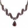 Royal style silver tone red diamante necklace features with a layer of linked red diamante wave, dangling at centre of a ruby teardrop rhinestone embellishment with small red round diamantes.