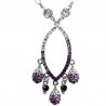 Purple diamante open teardrop dangle necklace adorns with clear, lilac and purple diamantes in a silver plated open teardrop dangling with three paved diamante teardrops and purple diamante drops, set on clear diamantes linked to silver plated teardrop chain.